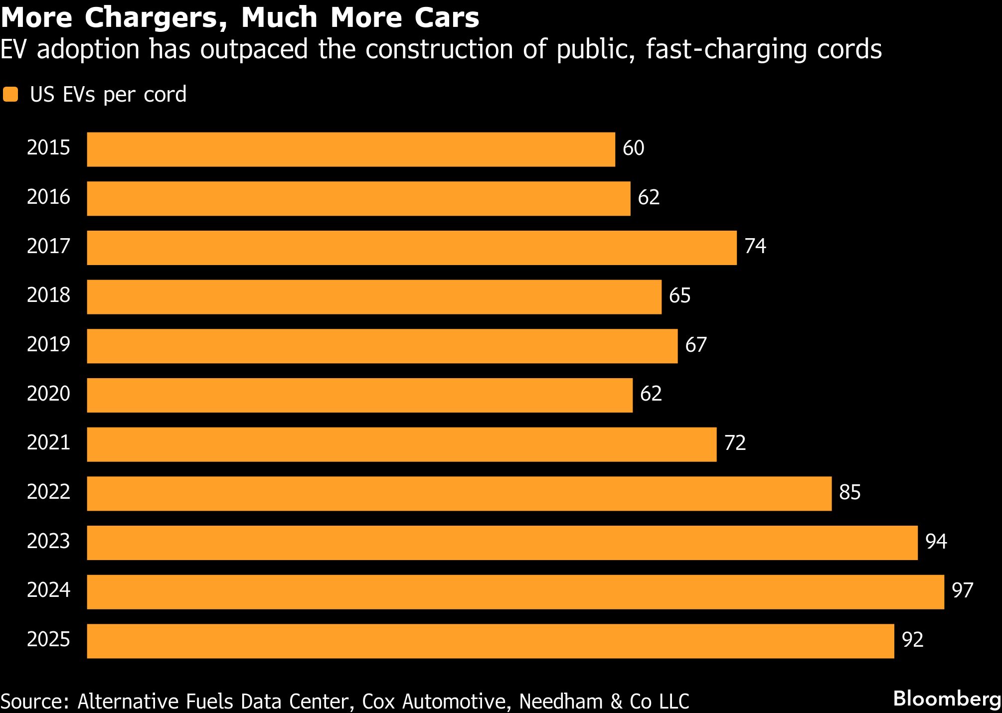 US chargers have become more reliable and far faster, which encourages more people to use them, according to Paren, a data platform focused on EV infrastructure. Charging networks added about 11,300 ultra-fast cords across the US last year, up 48% from 2024. And the high-speed buildout is only accelerating: In the fourth quarter, nearly one in four new chargers were capable of pumping at rates of 250 kilowatts or more, which can typically add 100 miles of driving range in less than 10 minutes.